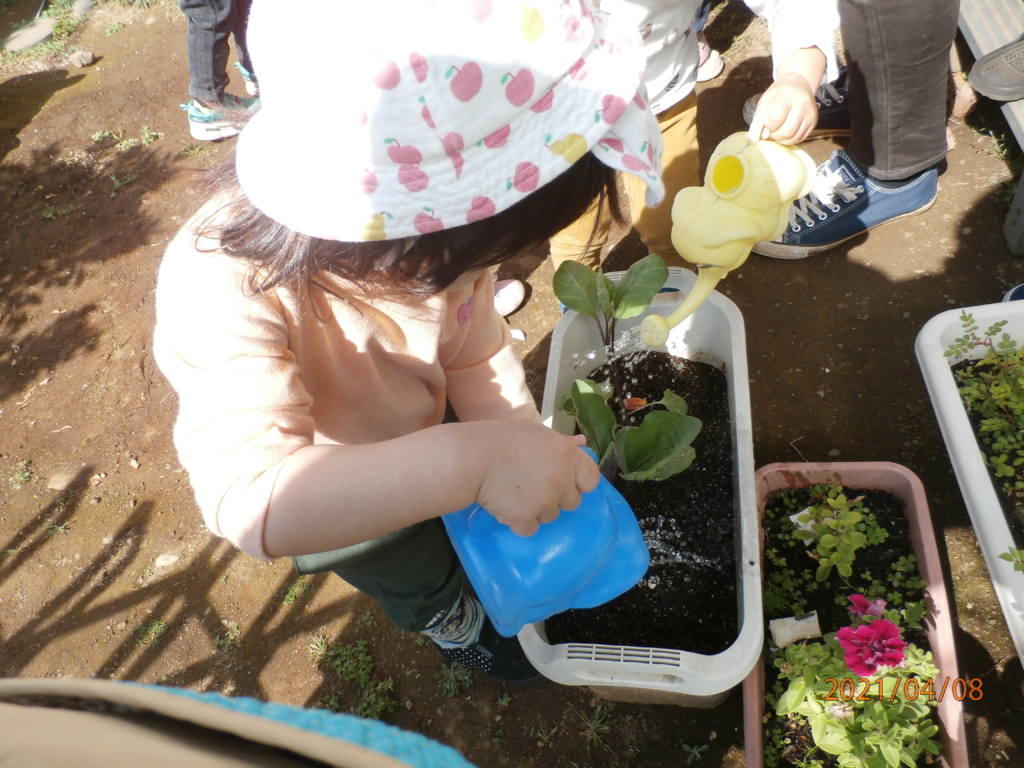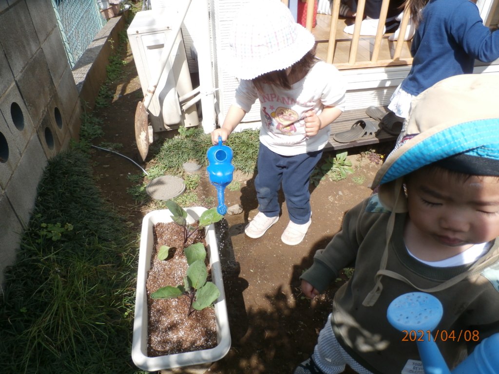2歳児のみんなとなすを植えました。毎日楽しみながら、お水をあげています。先日紫のきれいなお花も咲きました。