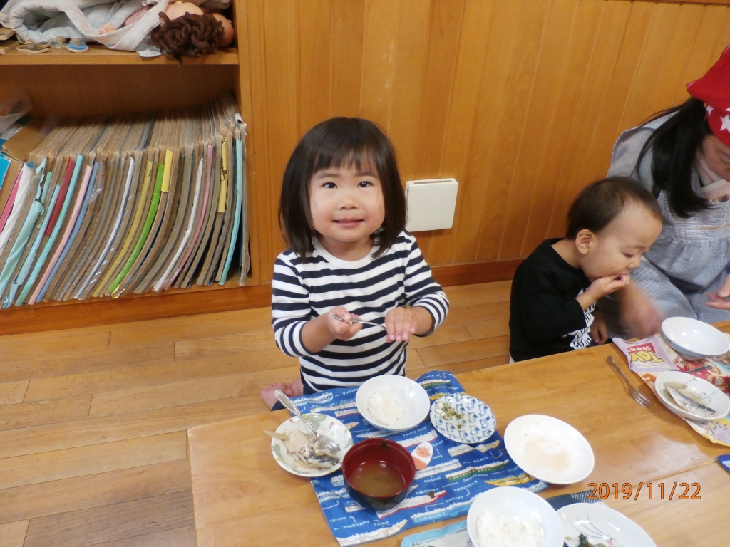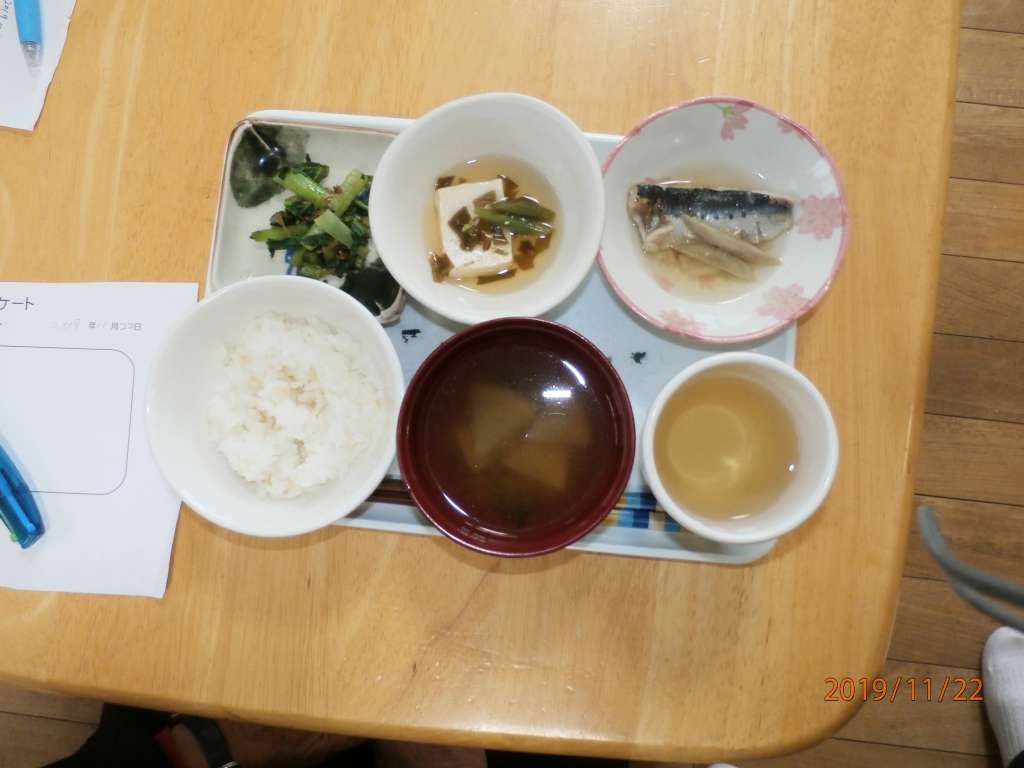 11月24日は和食の日です。こぐまこどものいえでは11月22日に和食の日の給食として、だしを使用した給食を提供しました。献立は豆腐のふくめ煮、小松菜おひたし、鰯とごぼうの煮物、玄米ご飯、大根と若布の味噌汁です。