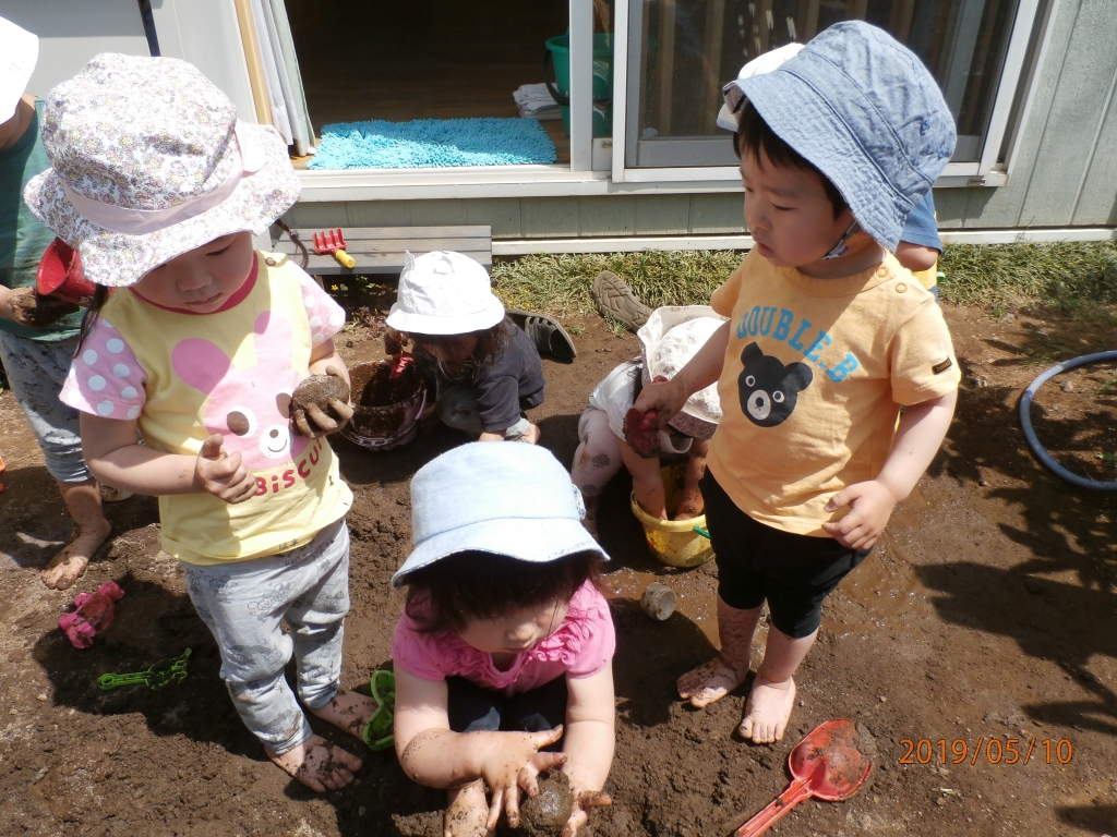 2歳児は泥団子づくりをしました。土の感触に驚く子、夢中であそぶ子など、それぞれです。