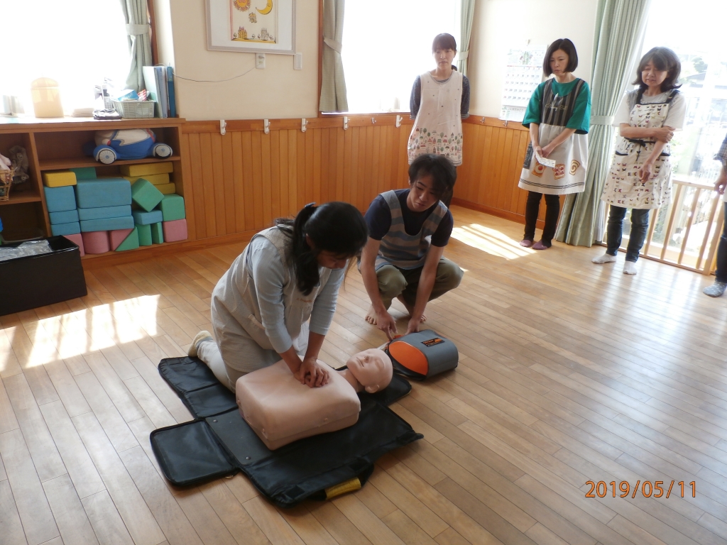 職員は救急救命講習。AEDの使い方の確認と人工呼吸と心臓マッサージ。備えておくことも大切です。